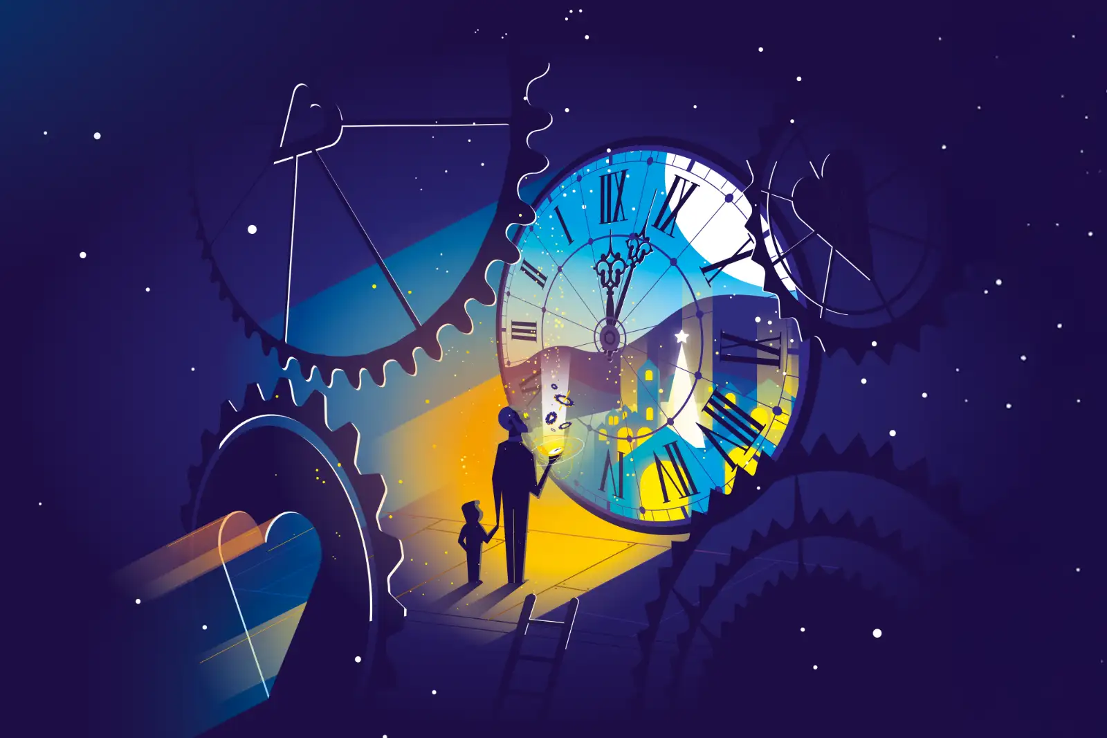 Er hieß Mastro Elia und wohnte in einer Werkstatt mit Blick auf die Piazza Grande, versteckt unter den Balken eines alten Daches. Dort, zwischen Zahnrädern und Zeigern, stellte Elia die Zeit ein…